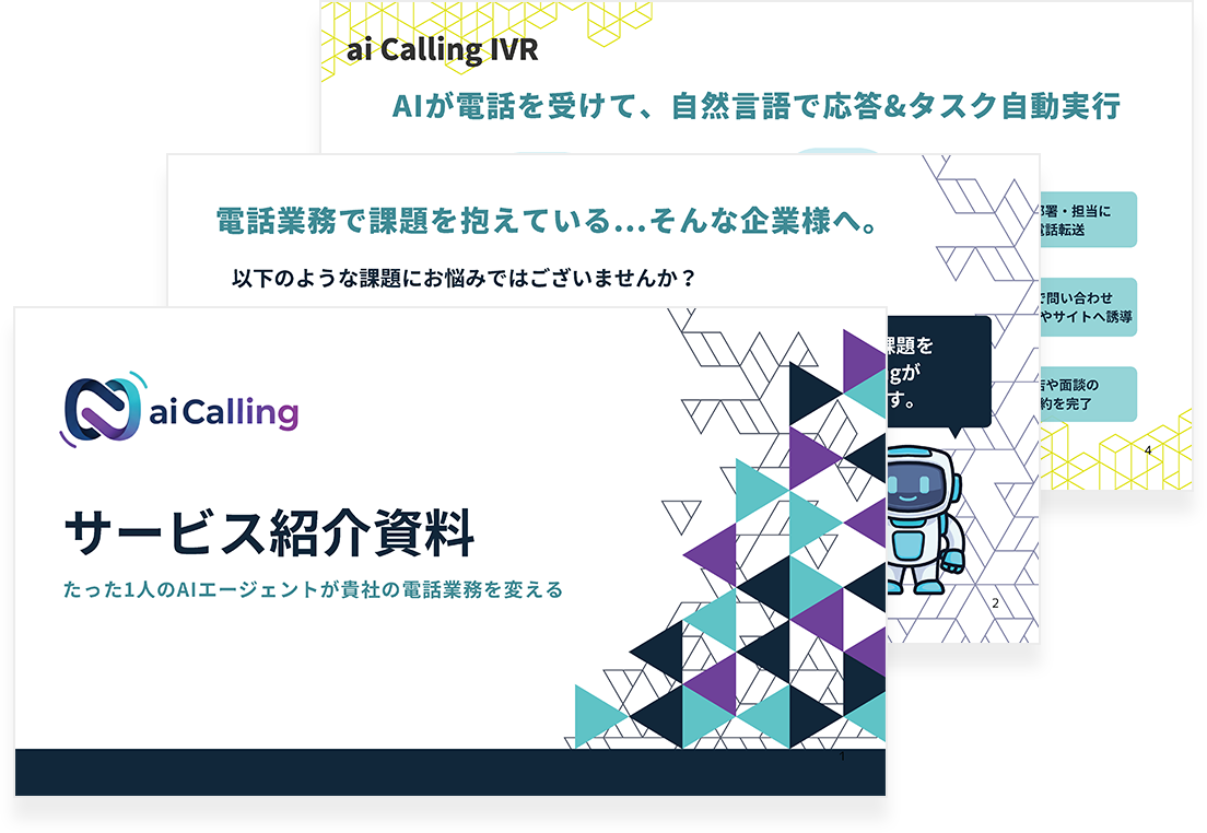 下記フォームより送信いただきますと、「ai Calling」の資料、およびAPI仕様書をダウンロードできます。